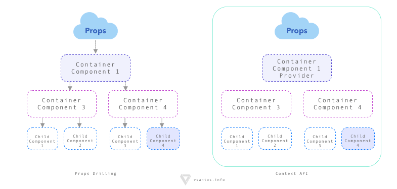 In the diagram at your left, you can see how we used to pass down props from Container Component 1 to Child Component 4, we have to pass down first the props to Container Component 4 and then pass down to 4, we still can do it but when we add more and more child component it’s getting really hard to maintain. At the right, we have the context API diagram, we only need to add a Provider component at the top level and then we are able to access the provider information from any child component.